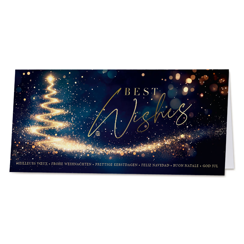 Description: Cette carte de vœux professionnelle se distingue par son visuel raffiné mêlant éclats lumineux et message doré sur fond bleu nuit.