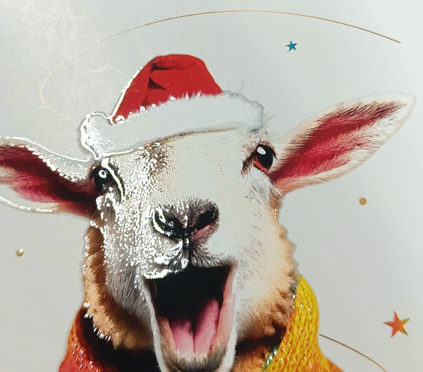 Vrolijke kerstkaart met schaap met kerstmuts en kleurrijke sjaal - FR (845.097)