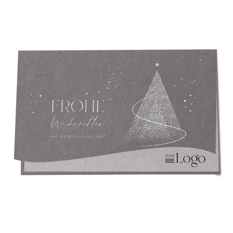 Detail-Info: Hinterlassen Sie bei Ihren geschäftlichen Kontakten einen bleibenden Eindruck mit unserer Firmen Weihnachtskarte aus anthrazitfarbenem Karton mit leuchtenden Tannenbäumen. Der Weihnachtsgruß und die Tannenbäume sind mit einer Silberfolie veredelt. Das silberfarbene Einlegblatt, das durch zwei Haltestanzungen fixiert wird, eignet sich für den Druck individueller Weihnachtsgrüße mit Firmenlogo.