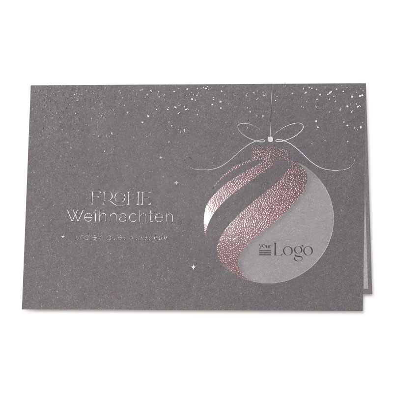 Detail-Info: Mit dieser Weihnachtskarte aus anthrazitfarbenem Karton und einer ausgestanzten Weihnachtskugel können Sie bei Ihren Geschäftspartnern punkten. Das silberfarbene Einlegeblatt bietet ausreichend Freiraum für einen netten Weihnachtsgruß mit Aufdruck des Firmenlogos.