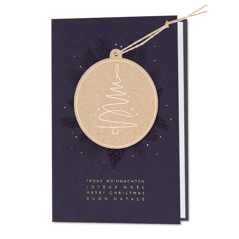 Detail-Info: Verwenden Sie eine festlich verzierte Weihnachtskarte mit einer Weihnachtskugel als exklusive Weihnachtsbotschaft. Der mehrsprachige Weihnachtsgruß ist mit einer Goldfolie veredelt. Die Weihnachtskugel kann als Christbaumschmuck verwendet werden.