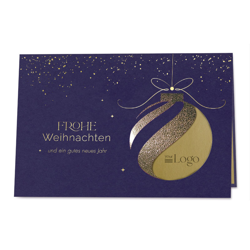 Detail-Info: Mit dieser Weihnachtskarte aus blauem Karton und einer ausgestanzten Weihnachtskugel können Sie bei Ihren Geschäftspartnern punkten. Das goldfarbene Einlegeblatt bietet ausreichend Freiraum für einen netten Weihnachtsgruß mit Aufdruck des Firmenlogos.