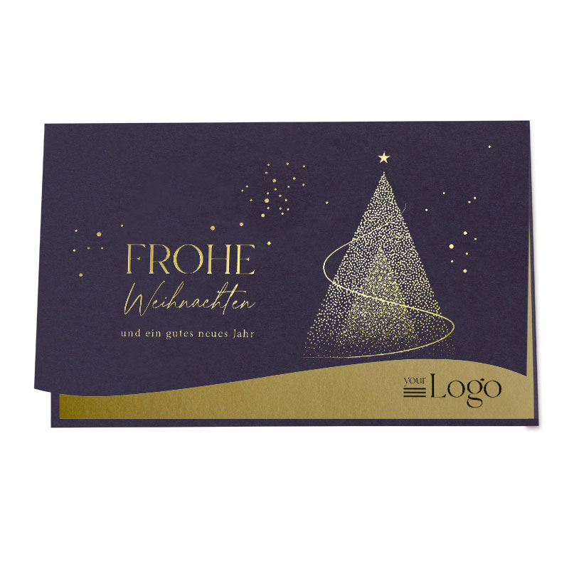 Detail-Info: Hinterlassen Sie bei Ihren geschäftlichen Kontakten einen bleibenden Eindruck mit unserer Firmen Weihnachtskarte aus blauem Karton mit leuchtenden Tannenbäumen. Der Weihnachtsgruß und die Tannenbäume sind mit einer Goldfolie veredelt. Das goldfarbene Einlegblatt, das durch zwei Haltestanzungen fixiert wird, eignet sich für den Druck individueller Weihnachtsgrüße mit Firmenlogo.
