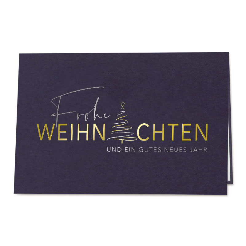 Detail-Info: Diese blaue Weihnachtskarte setzt ganz besondere Akzente. Der Mix aus Weihnachtsgruß und Tannenbaum, verziert mit Silber- und Goldfolie, macht diese Karte zu etwas Einzigartigem und kommt bei den Geschäftspartnern gut an.