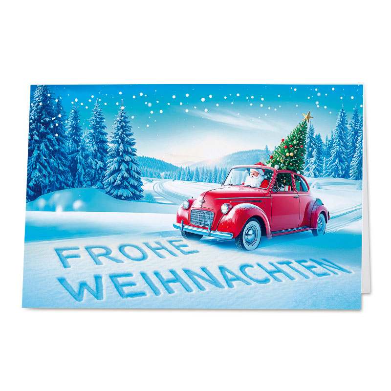 Detail-Info: Diese himmlische Weihnachtskarte mit Weihnachtsmann, der in einem roten Auto unterwegs ist, bringt den festlichen Spruch visuell zum Ausdruck: "Von drauß' vom Walde komm ich her; ich muss euch sagen, es weihnachtet sehr!"