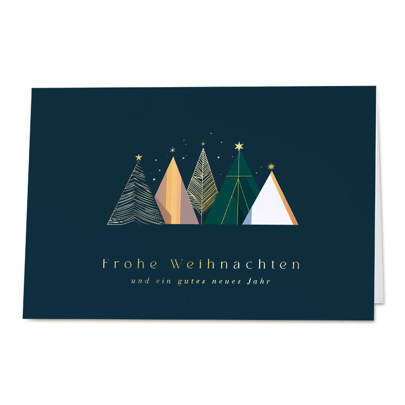 Detail-Info: Diese Weihnachtskarte mit den zierlichen Tannenbäumen ist mehr als nur Tradition. Durch den Goldfoliendruck des Weihnachtsgrußes setzen sie ganz besondere Akzente. Die Innenseite eignet sich für den Eindruck von individuellen Weihnachtsgrüßen mit Firmenlogo.