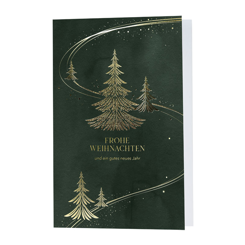 Grüne Firmen Weihnachtskarte mit filigranen Tannenbäumen in Goldfolie (865.005)
