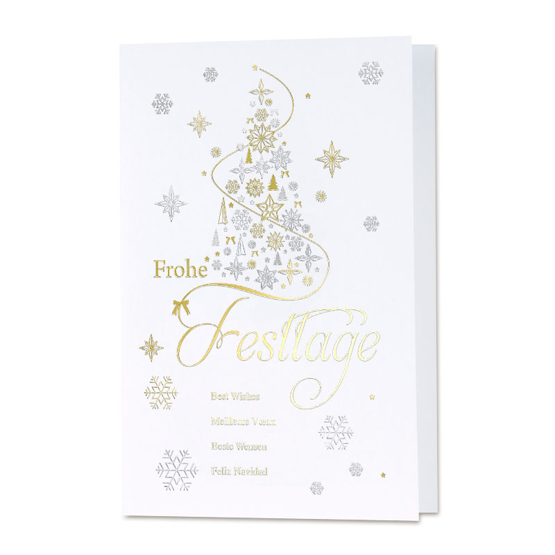 Detail-Info: Üblich zur Adventszeit denken Sie an Ihre internationalen Geschäftspartner und senden ihnen eine exklusive Weihnachtskarte mit Tannenbaum-Motiv, verziert mit Silber- und Goldfolie.