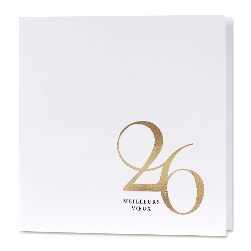 L'élégance à l'état pur et sobriété sont les maîtres-mots de cette carte de fin d'année 2026 au papier blanc réhaussé de dorure. Il ne manque que vos texte et logo de société pour remercier vos relations professionnelles pour l'année passée et celle à venir.