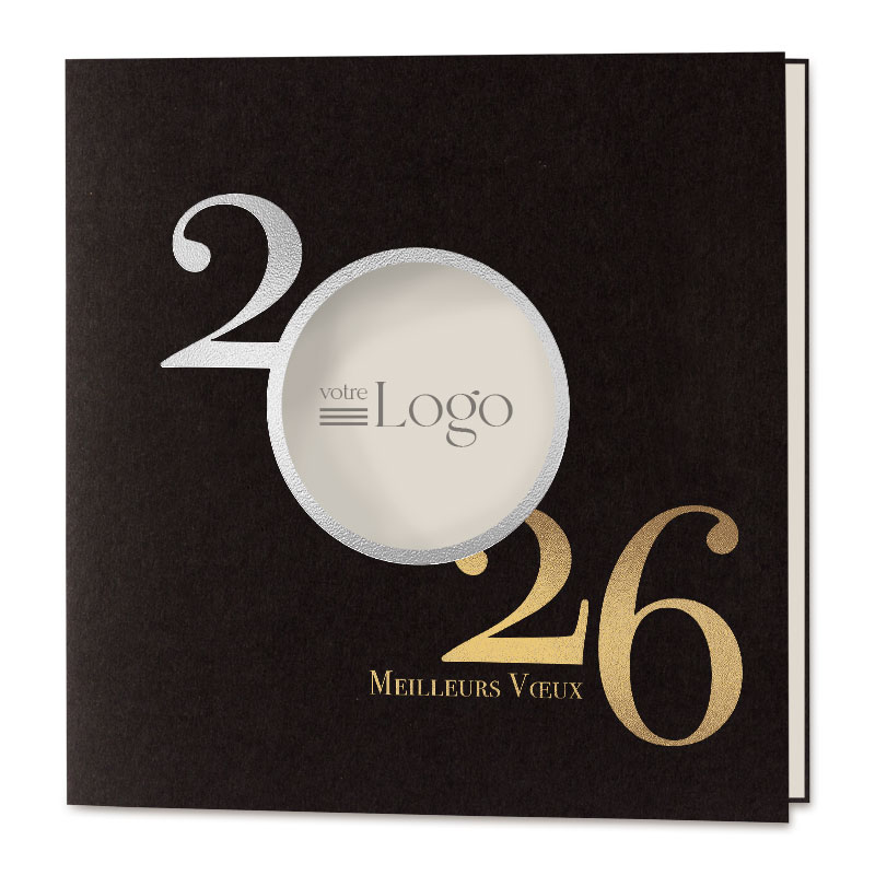 Une couverture au papier noir réhaussé de dorure or et argent pour habiller vos vœux d'élégance, c'est ce que vous promet cette carte de vœux 2026 à la couverture découpée d'un cercle. Votre texte et logo s'impriment sur l'intercalaire double et rend votre logo d'entreprise visible au premier coup d'œil.