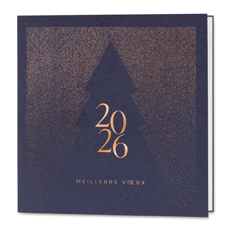 Cette carte de vœux 2026 au papier bleu nuit réhaussé de dorure cuivrée sera votre messager pour souhaiter une bonne année à vos clients et fournisseurs. Votre texte s'imprime sur l'intercalaire fourni.
