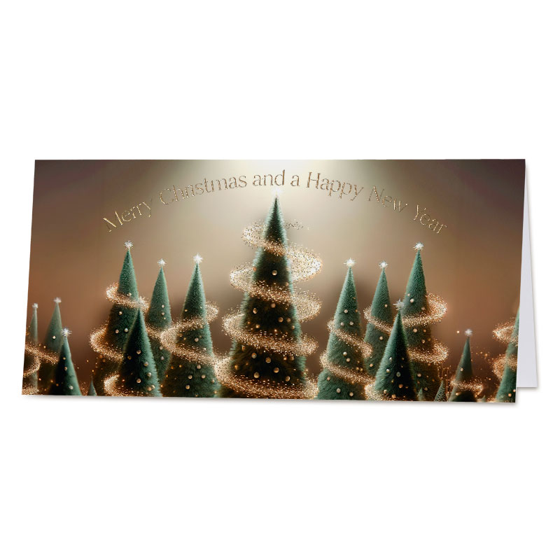 Feestelijke kerstkaart met een rij prachtig versierde kerstbomen, omwikkeld met fonkelende gouden lichtslingers. De tekst ‘Merry Christmas and a Happy New Year’ geeft deze kaart een warme en stijlvolle uitstraling.