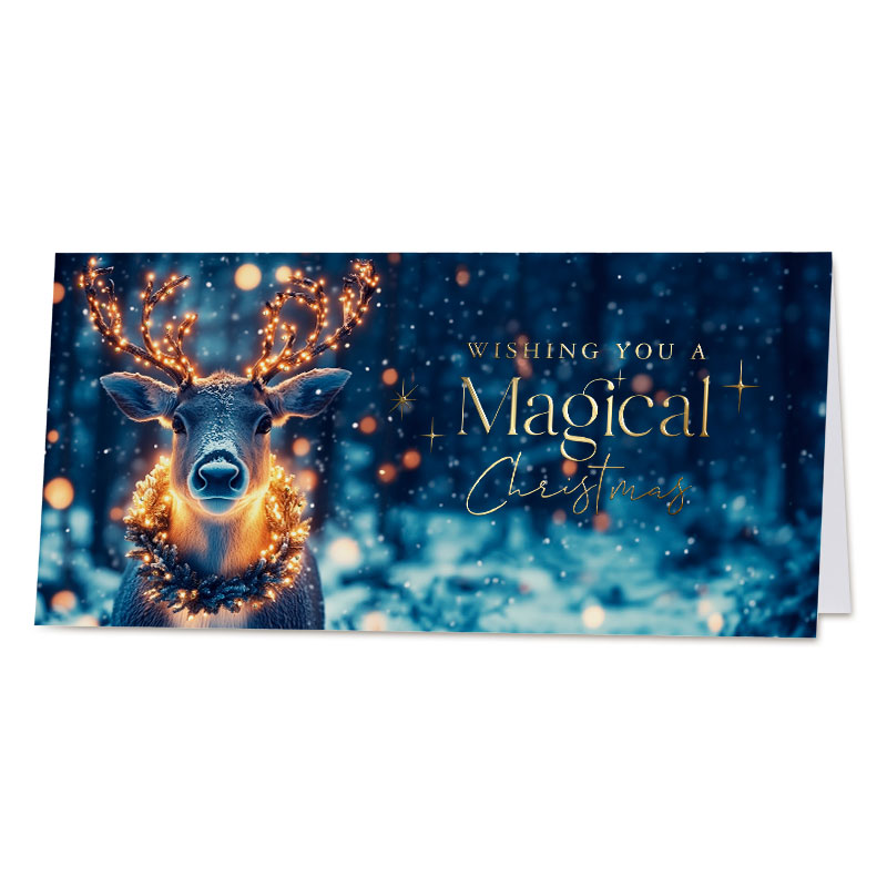 Sfeervolle kerstkaart met een betoverend wintertafereel van een rendier met fonkelende lichtjes in het gewei. De tekst ‘Wishing you a Magical Christmas’ schittert in elegante goudfolie, perfect om warme feestwensen over te brengen.