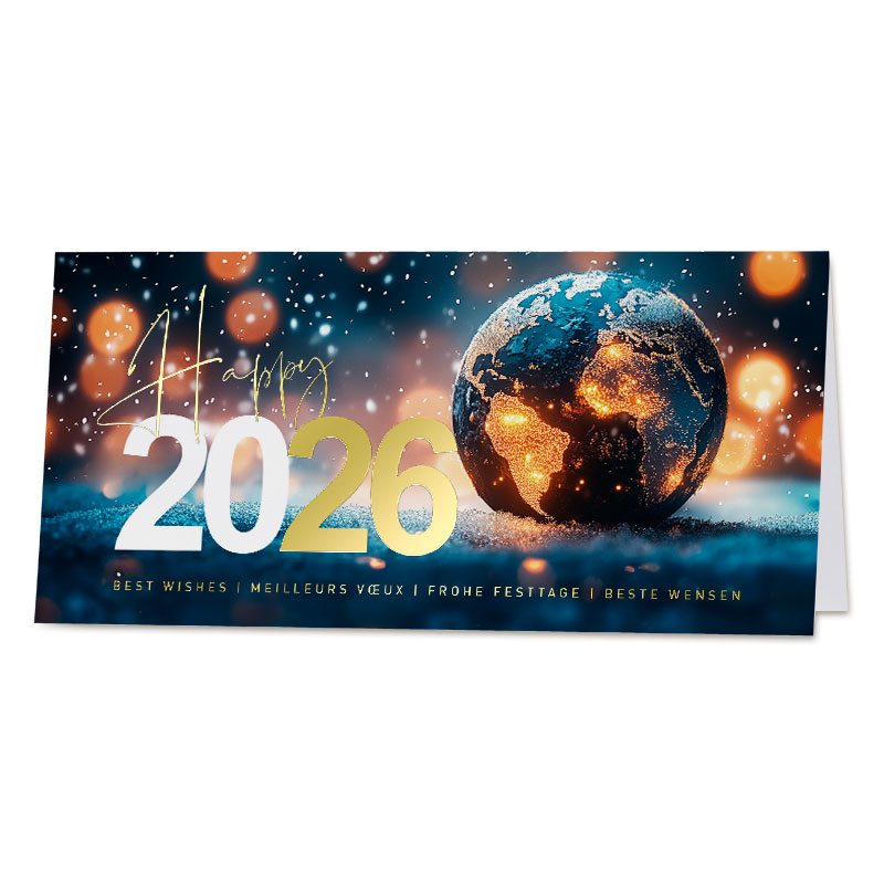 Stijlvolle zakelijke nieuwjaarskaart met een sprankelende wereldbol in warme tinten, afgewerkt met luxueuze goudfolie en glanzende vernis voor een verfijnde uitstraling. Wens uw relaties een schitterend 2026 in vier talen: Best Wishes, Meilleurs Vœux, From Festtage, Beste Wensen.