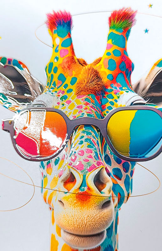 Vrolijke en speelse nieuwjaarskaart met een kleurrijke giraf die een al even kleurrijke zonnebril draagt. De tekst ‘Add a little color to each day’ in combinatie met feestelijke accenten maakt deze kaart perfect om met een glimlach en optimisme het nieuwe jaar te beginnen.